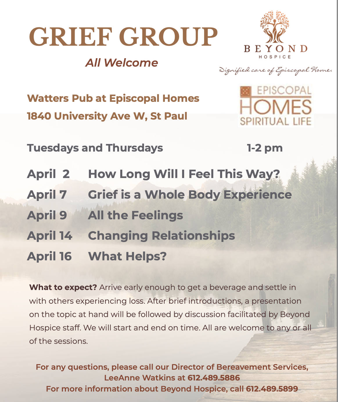 At Episcopal Homes Pub, 1-2pm Tuesdays and Thursdays April 2, 7, 9, 14, 16. All welcome. Facilitated by Beyond Hospice staff.